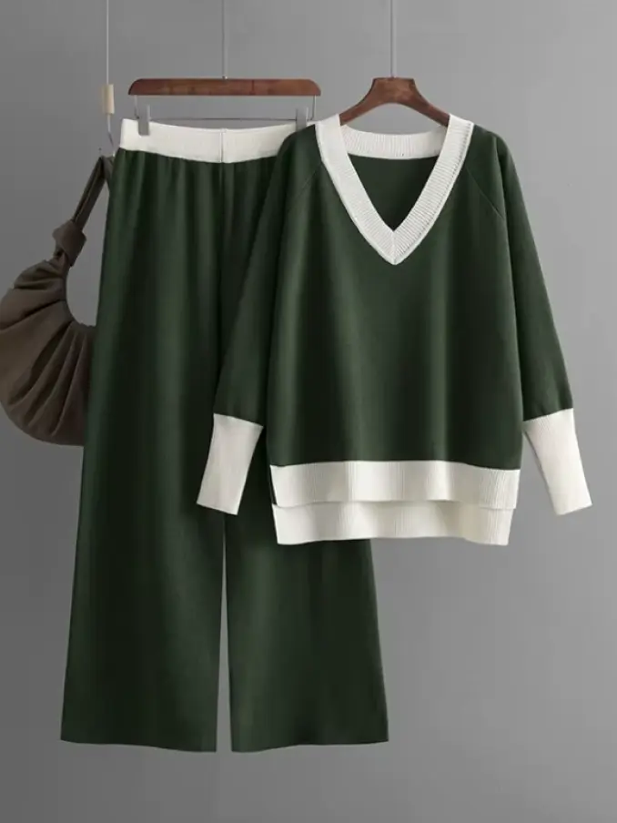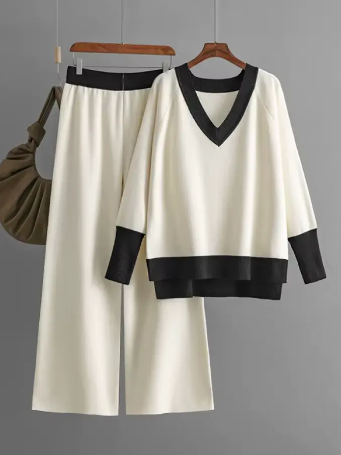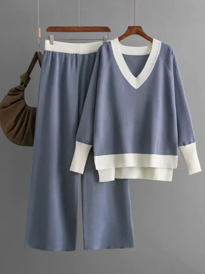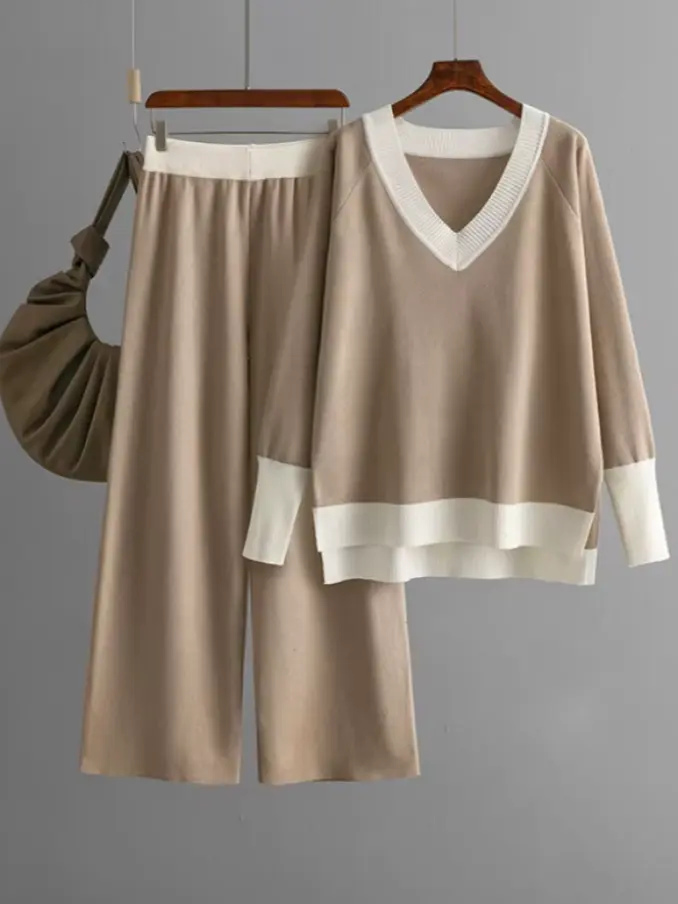 Casual Suit for Women Sweater Spring Autumn V-neck Top Loose Wide-leg Pants Knit Two-piece Suit