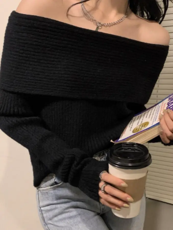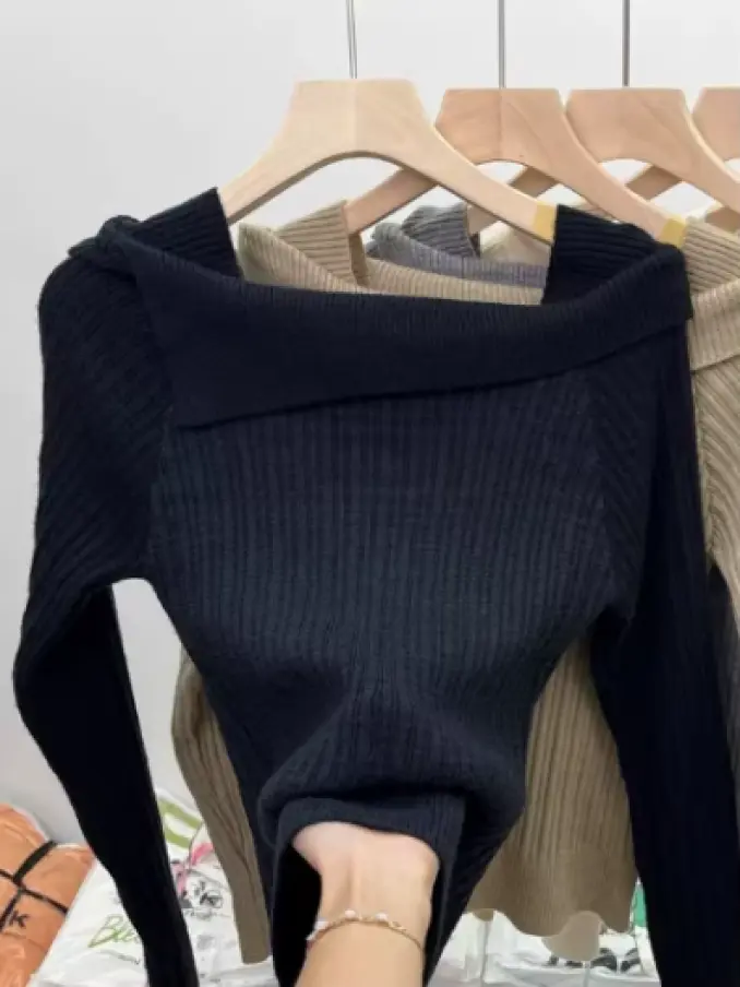Women Slim Off Shoulder Slash Neck Long Sleeve K...